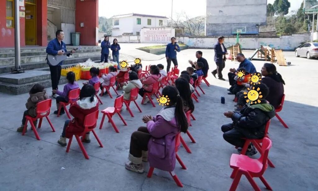 在阳光和煦的春日里,河界营村小学的操场一片欢声笑语。“爱心爸爸”怀抱吉他轻弹旋律,瞬间点燃了孩子们的热情。《爸爸妈妈去上班》的轻快节奏中,留守儿童用歌声倾诉思念;在《两只老虎》《春天在哪里》的经典旋律里,孩子们与志愿者互动互唱,歌声与笑声在山间回荡。