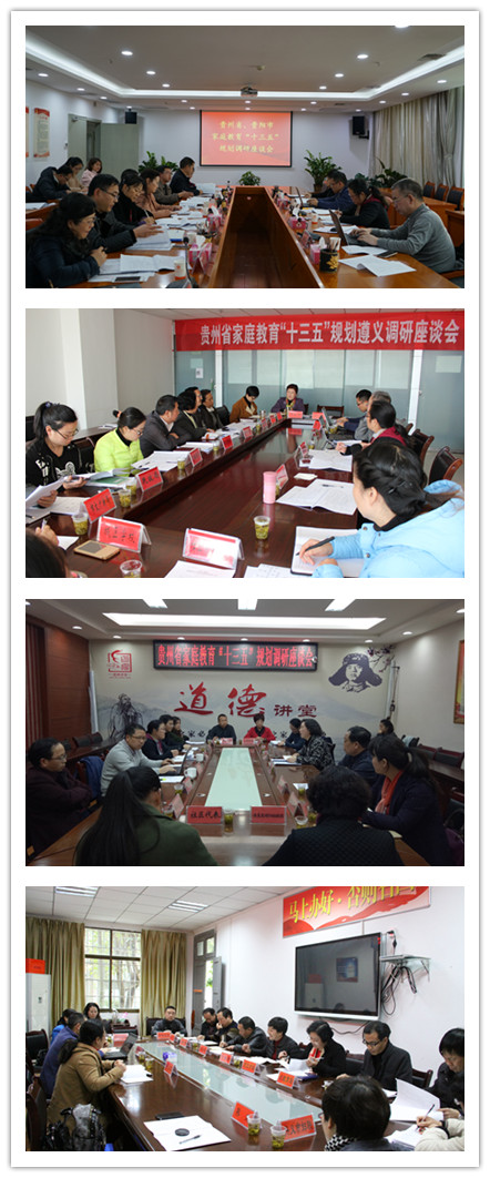 为深入贯彻党的十八大和十八届三中、四中、五中、六中全会精神,认真落实习近平总书记系列重要讲话精神特别是关于“注重家庭、注重家教、注重家风” 的重要指示,及时贯彻落实《关于指导推进家庭教育的五年规划(2016—2020 年) 》(以下简称《规划》)和全国家庭教育工作电视电话会议精神,更好地推动制定我省“十三五”家庭教育规划, 12月2日-9日,省妇联、省家庭教育学会组织贵州省家庭教育“十三五”规划编制专题调研。由省妇联儿童部负责人带队,省社科院城经所长、研究员王兴骥及贵州大学教授季飞博士以及省家庭教育学会代表组成的调研组先后赴黔西南、贵阳、遵义及铜仁开展调研座谈。调研市州妇联、教育局、文明办、民政局、文广局、卫计委、科协、关工委相关领导及业务处室负责人,社区和学校负责人代表参加了调研座谈会。