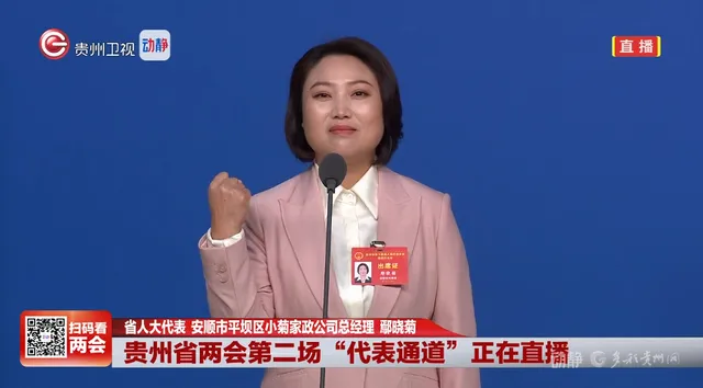 省人大代表、安顺市平坝区小菊家政公司总经理鄢晓菊走上贵州省两会第二场“代表通道”,回答记者提问。