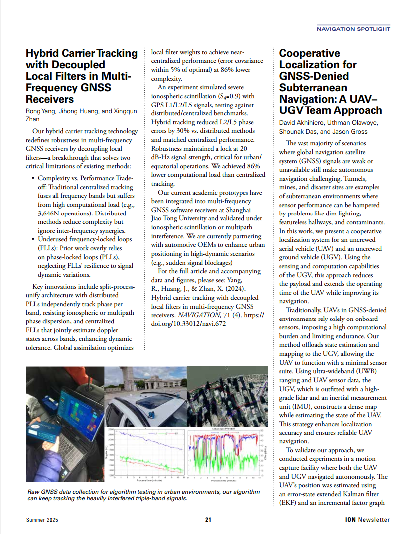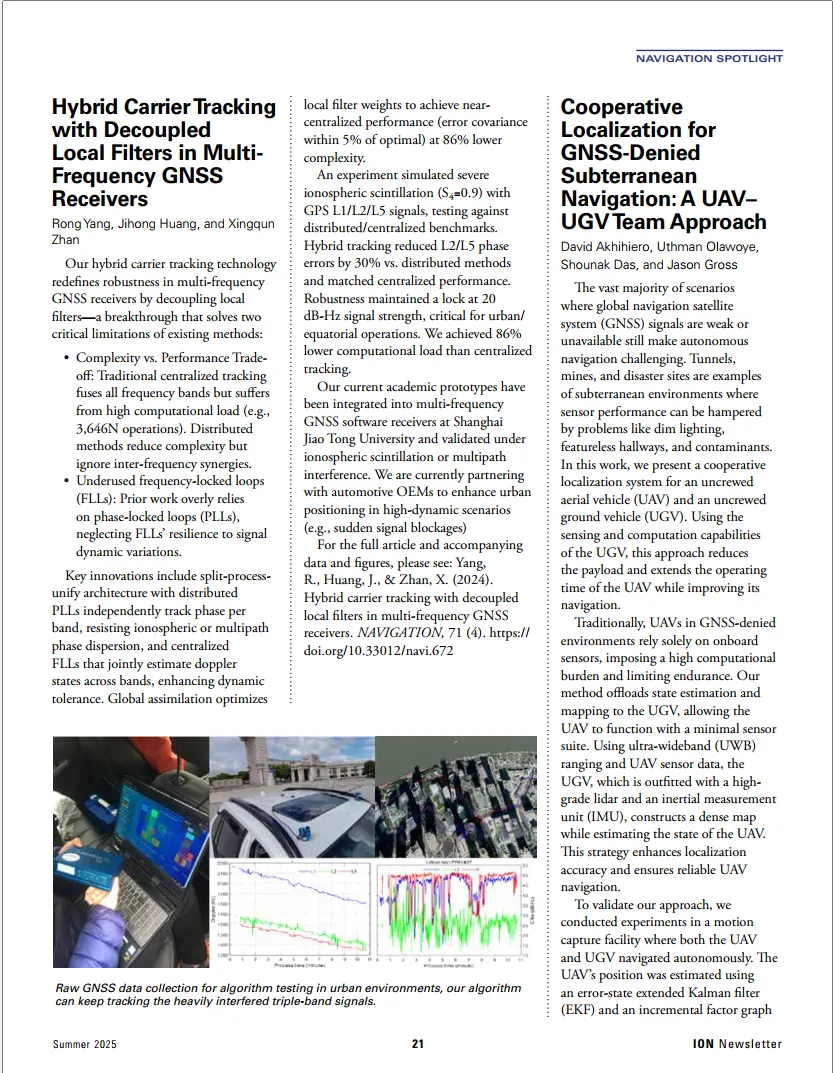 近五年,其团队在IEEE TAES、NAVIGATION、GPS Solutions等期刊及会议上发表多篇重要论文,研究成果先后入选《NAVIGATION》与《Chinese Journal of Aeronautics》的亮点论文,获得了国际同行关注。此次获奖,正是肯定了她提出的时空频理论框架及其解决业界核心导航难题的价值,标志其研究为从根本上理解并缓解复杂环境下的导航瓶颈问题提供了新的理论路径。