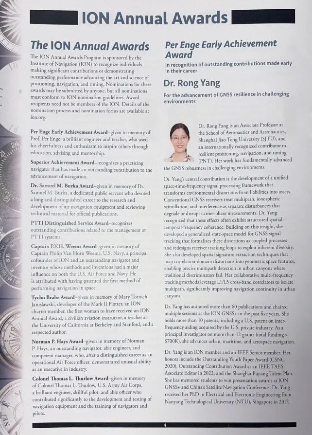 美国导航学会是导航定位领域最权威的国际学术组织之一,其表彰不同职业生涯阶段学者的各奖项,每年只授予一人。其中,面向资深学者的最高荣誉是“Johannes Kepler Award”;面向青年学者的最高荣誉正是杨溶副教授获得的“Per Enge Early Achievement Award”,旨在表彰对定位、导航与授时(PNT)技术发展产生显著影响的青年科技人才。