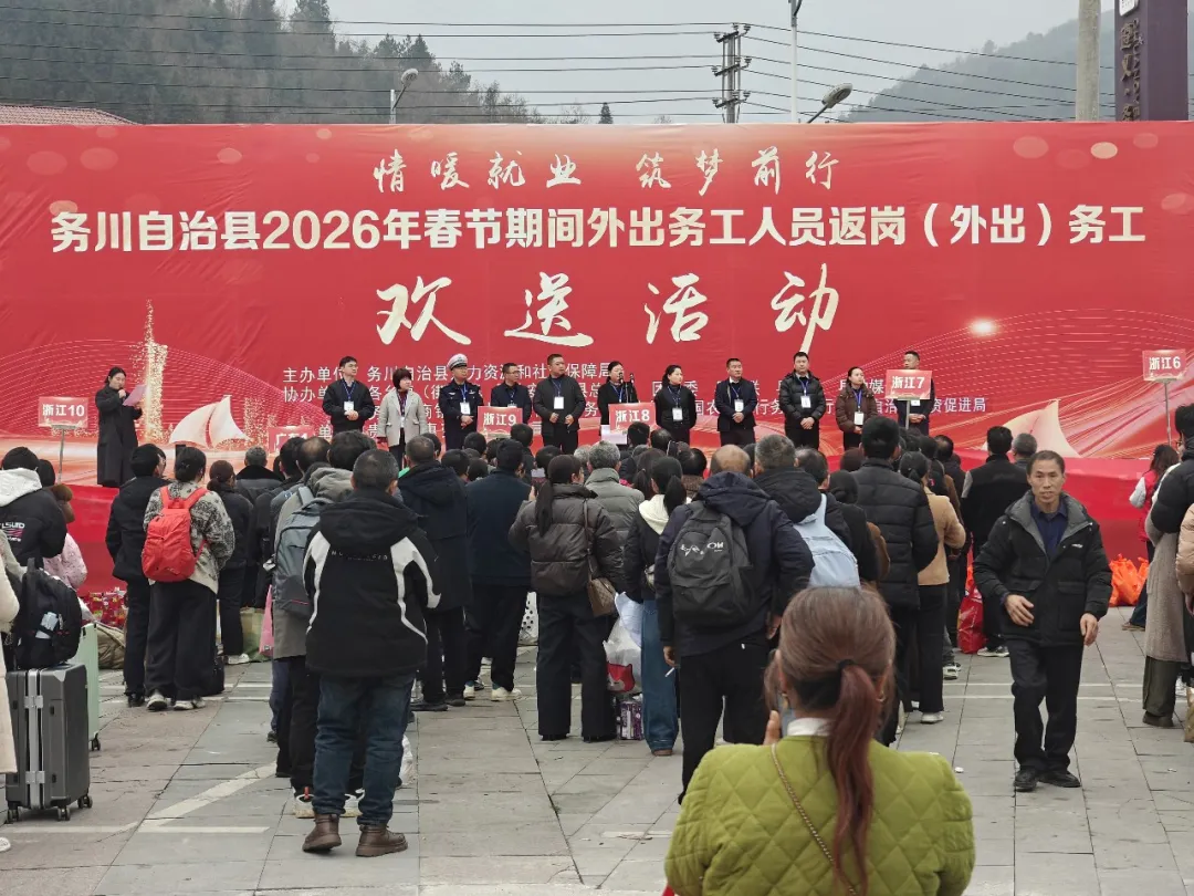 为扎实推进2026年务川自治县两节返乡返岗暨“春风行动”,保障农村劳动力有序返岗、稳定就业,维护外出务工妇女合法权益,2月25日,务川自治县举行外出务工人员集中返岗欢送仪式,为外出务工妇女提供服务保障、助力平安启程。