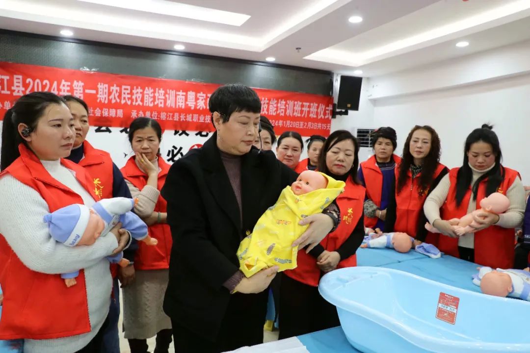 在榕江县车民街道妇女创业培训中心,受训妇女对新生儿护理进行模拟训练(李长华 摄 贵州图片库供图)