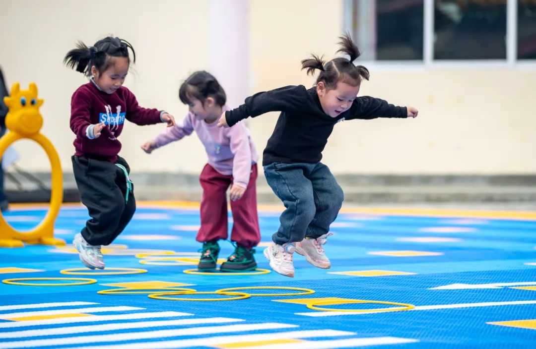 从江县刚边壮族乡中心幼儿园的小朋友在参加户外运动