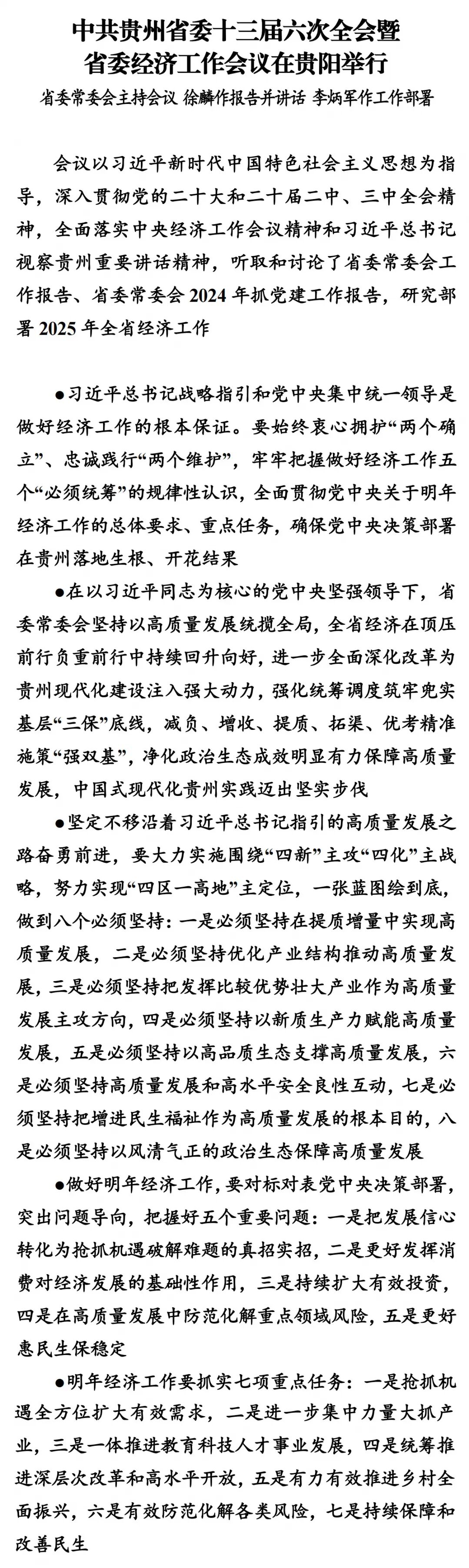 会议指出,做好明年经济工作,要以习近平新时代中国特色社会主义思想为指导,全面贯彻党的二十大和二十届二中、三中全会精神,深入贯彻习近平总书记视察贵州重要讲话精神,认真落实中央经济工作会议部署,坚持稳中求进工作总基调,完整准确全面贯彻新发展理念,服务融入新发展格局,坚持以高质量发展统揽全局,守好发展和生态两条底线,坚持主战略主定位,突出大抓产业、主攻工业,大力提振消费,提高投资效益,推动科技创新和产业创新融合发展,加快构建富有贵州特色、在国家产业格局中具有重要地位的现代化产业体系,进一步全面深化改革、扩大对外开放,更好激发活力、稳定预期、防范风险,不断提高人民生活水平,顺利完成“十四五”规划目标任务,为实现“十五五”良好开局打牢坚实基础。