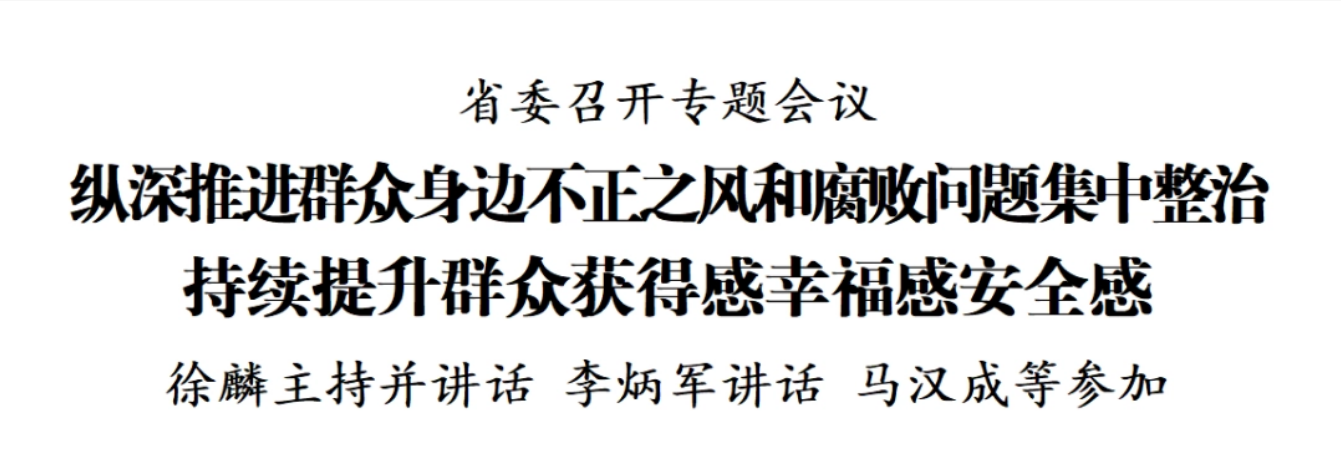 会议强调,要谋深抓实集中整治工作,在切实保障和改善民生中找准切入点、发力点,持续深化“校园餐”、农村集体“三资”管理、乡村振兴资金使用监管、医保基金管理、养老服务等方面突出问题治理,注重步步深入统筹谋划、分类施策靶向出击、系统施治标本兼治,让群众更多受益、更加满意、更为可感可及。要以强化上下联动、左右协同进一步增强整治合力,压紧压实全省各地各有关部门整治责任,以改革创新之举破解难题、推动工作、提升质效。