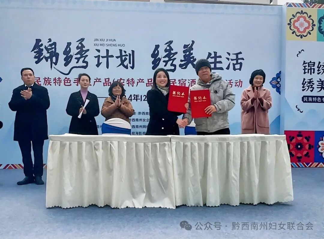 活动现场,州妇联与兴义子遇民宿、兴义市心远问峰民宿、万峰林榕宿民宿等十家精选民宿(酒店)签署合作协议,并颁发十家民宿企业“黔西南州锦绣计划民族特色手工产品特约经销商”授权书。随后,民宿(酒店)的代表与锦绣计划企业的代表进行了面对面的交流,共同探讨合作机会。