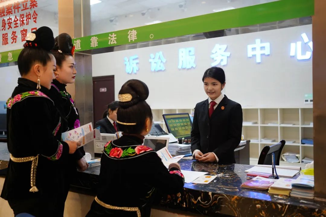 (立案“双语窗口”“乡音法官”白木兰正在接待苗族女同胞)