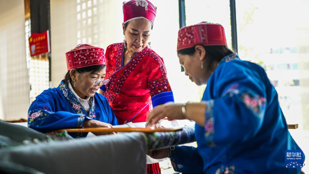 龙禄颖(中)在位于贵州省施秉县的舞水云台非遗工坊进行刺绣创作(10月10日摄)。新华社记者 陶亮 摄